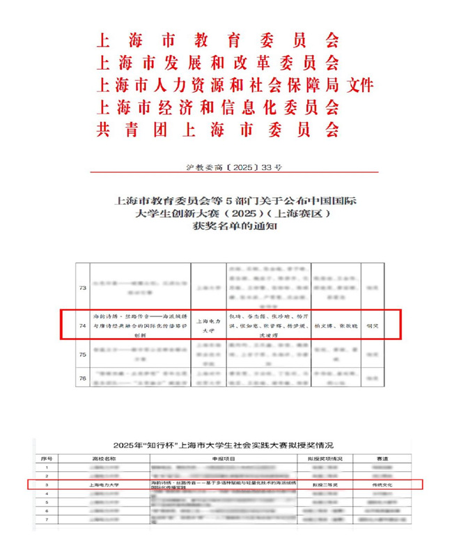 在2025年“知行杯”上海市大学生社会实践大赛中,由谷杰儒、包琦、张珍瑜、博赫丹(留学生)等15名同学完成,柏文博、张欲晓、余嘉老师指导的项目《海韵诗绣·丝路传音——基于多语种赋能与轻量化技术的海派绒绣国际化传播实践》获得上海市赛二等奖。
