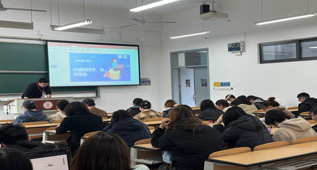 通过学部主导、网格落地、精准施策三维联动,构建全链条反诈责任体系,实现“预防—排查—干预”闭环管理,成效显著。学部成立由党委书记、主任任双组长的反诈工作领导小组,联合临港高校派出所开展专题反诈讲座,覆盖师生超300人次,同步建立“警校联动、快速响应”处置机制,确保涉诈线索第一时间介入、高效处置;推行“辅导员—班委—宿舍安全员”三级网格化管理体系,宿舍安全员每周常态化排查风险隐患,班委实时动态上报可疑信息,全年累计干预潜在诈骗线索12条,实现风险早发现、早阻断;针对不同年级学生及兼职学生、游戏爱好者等高危人群分别开展“安全教育主题班会”“反诈知识竞赛”“一对一”预警谈话等活动,精准推送反诈案例与防范技巧,实现“教育无死角、风险早干预”。